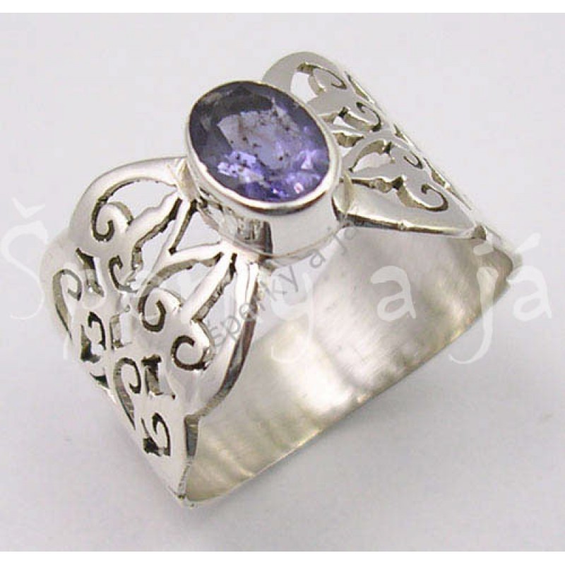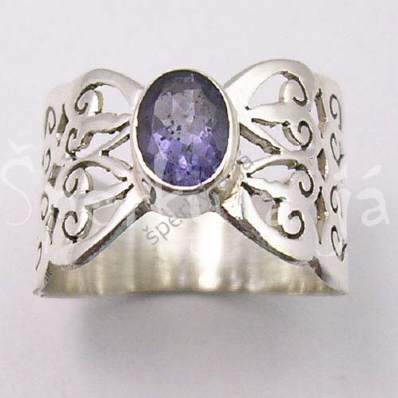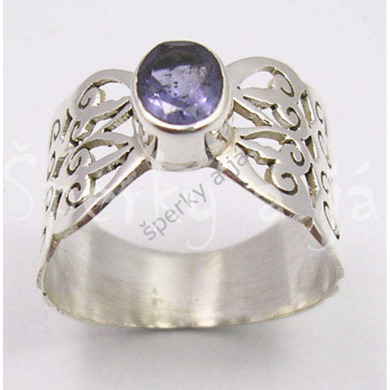 Materiál: stříbro 925/1000 Barva materiálu: stříbrná lesklá Specifikum: prsten byl ručně vyroben, nádherný originální kus šperku s výraznou obroučkou Velikost: dle výběru Velikost hlavy prstenu: zdobení sahá cca do poloviny obroučky napravo i nalevo od lůžka kamene, proto přesně velikost hlavy nelze měřit Centrální kámen: přírodní broušený iolit Barva kamene: tmavší fialková průhledná Velikost centrálního kamene: cca 7 x 5 mm (ovál) Váha prstenu: cca 3,20 g